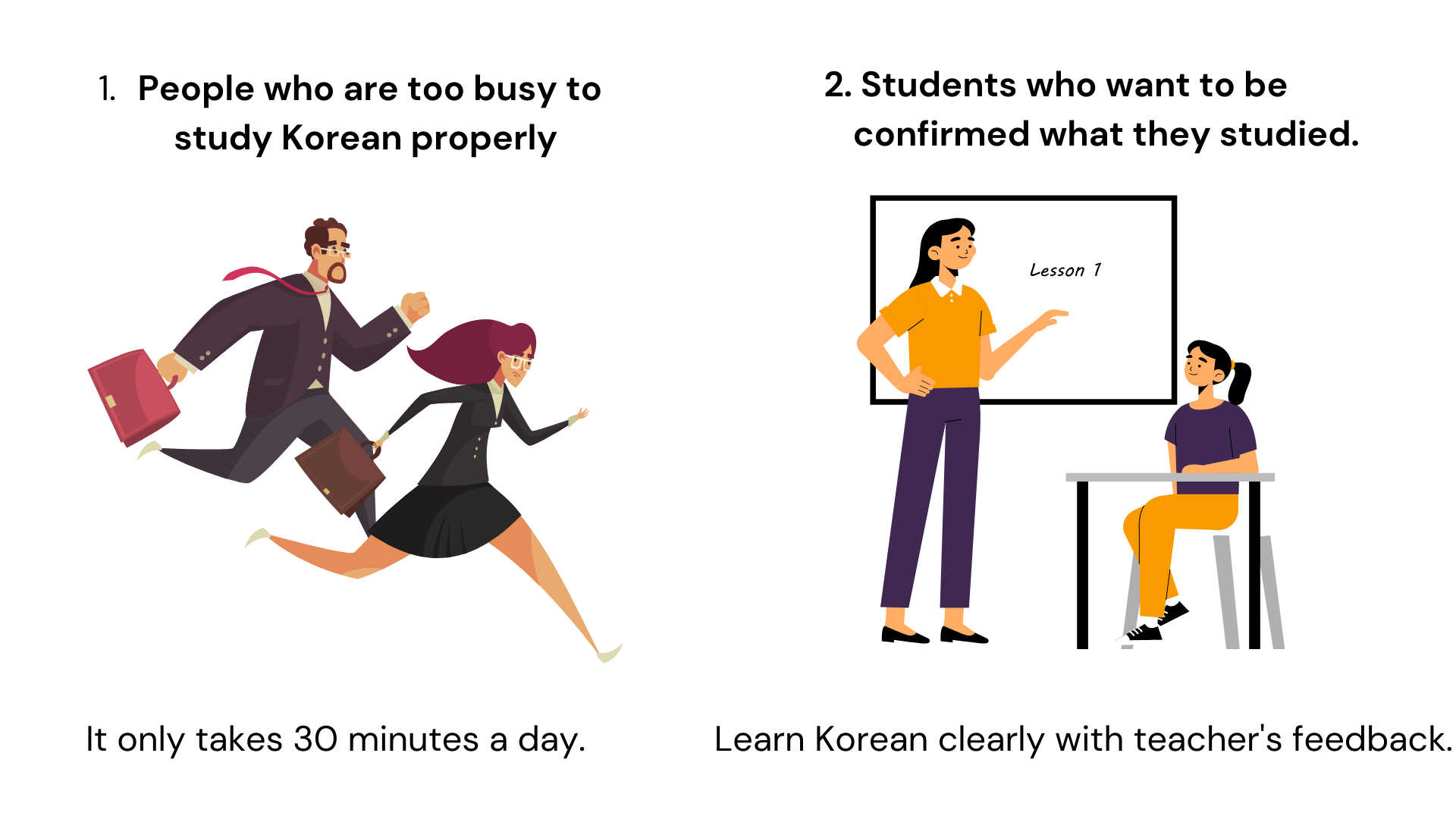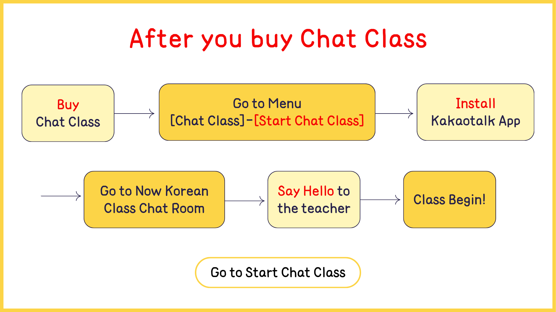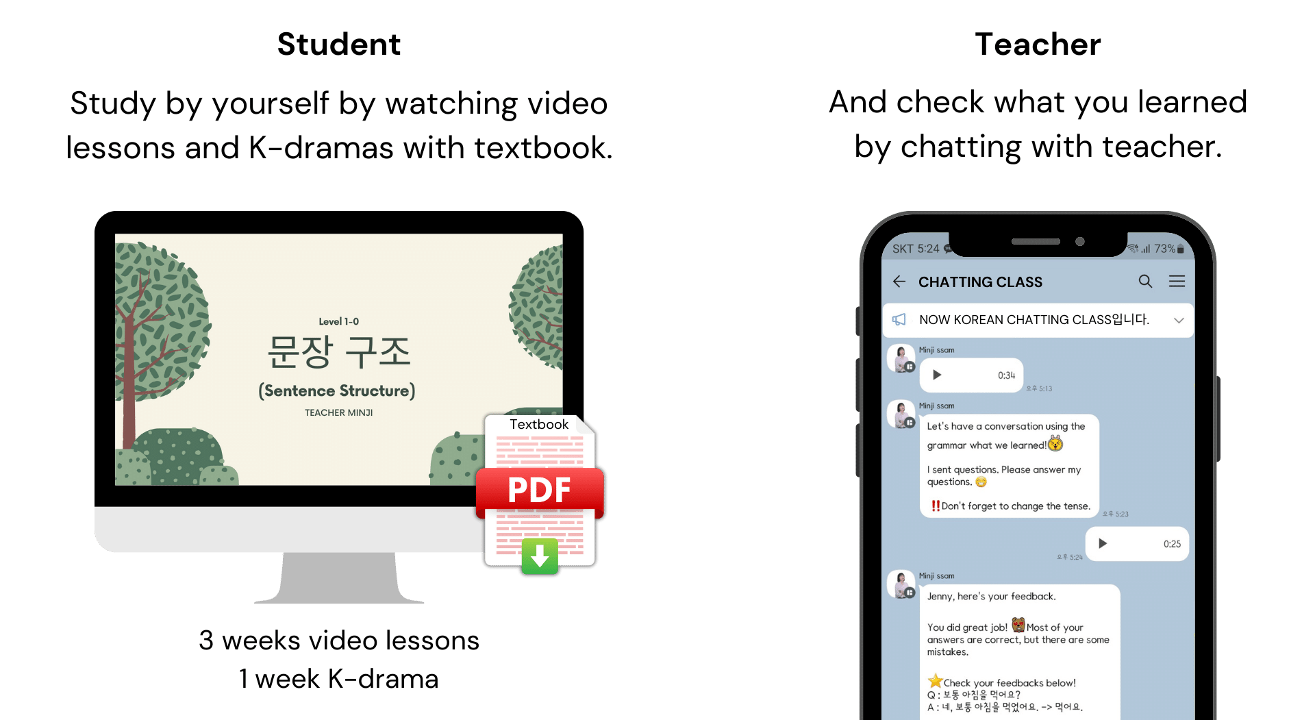 In Chat Class, students study on their own by watching video lessons and dramas, and do homework sent by the teacher through Kakaotalk chat. Then the teacher will provide feedback. You can check what you have learned through Kakaotalk chatting class with teacher.