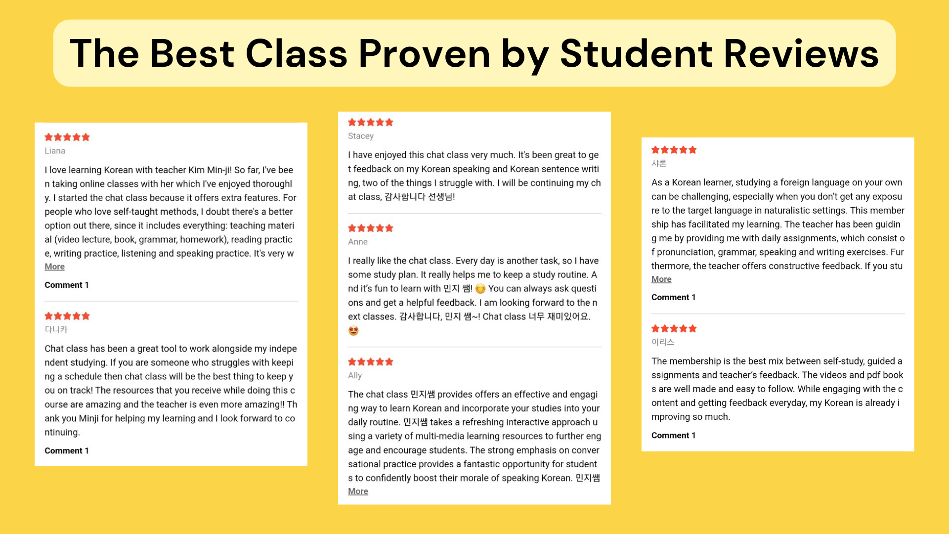 With homework videos, expression explanation video lessons, and textbooks provided, you can easily learn Korean in Chat Class.