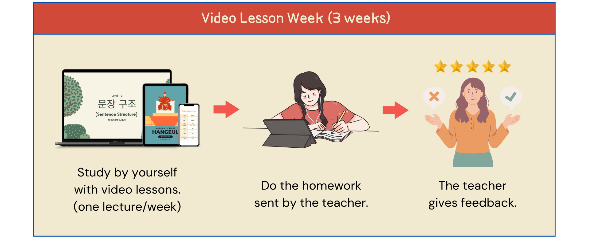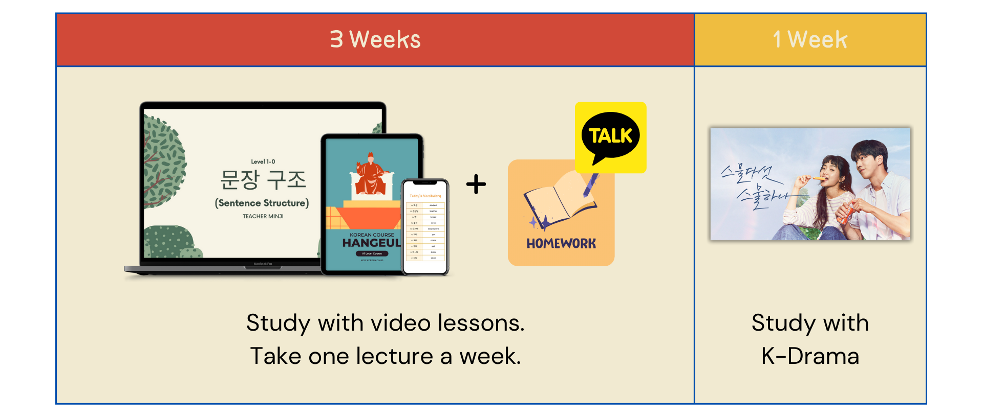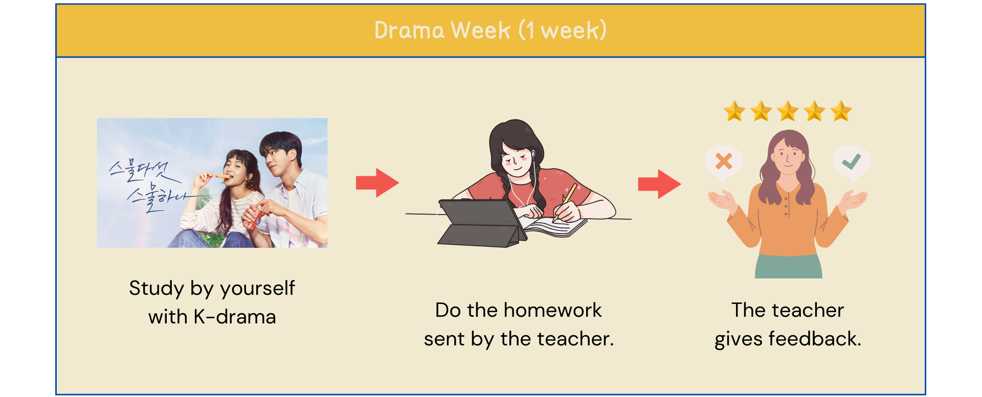 In Chat Class, for three weeks, you will study by watching video lessons, and for one week, study by watching K-dramas. During these four weeks, teacher will send homework and provide feedback through chat. While using Chat Class, you can access all the lessons of Now Korean Class.